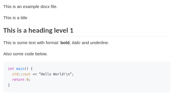 Here, we can see pandoc keeps some of the format (using BOLD for bold fonts, and _italic_ for italic format). However, it removes some spaces in the code section.