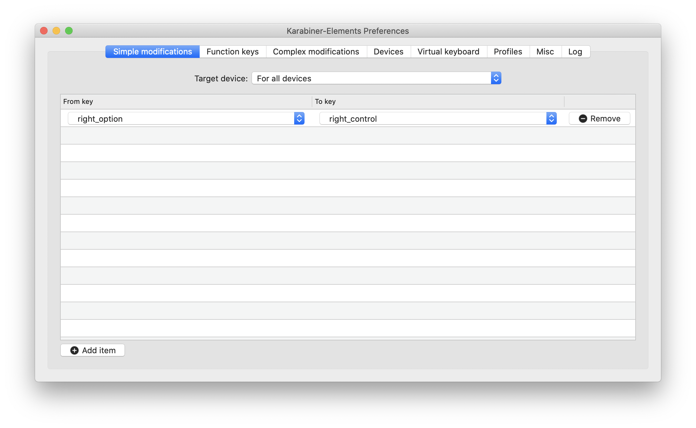Karabiner-Elements is a software to help us re-map the keys in a finer way. Download, install and start the software. In its Preference, we can configure it to map the right Option to right Control key.